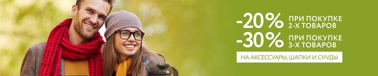 Условия акции: при покупке двух товаров из ассортимента аксессуаров: кошельков, визитниц, ключниц, брелоков, шапок, палантинов, платков и снудов, предоставляется скидка 20%, а при покупке трёх таких товаров – скидка 30%. В случае, если в чеке присутствует более трёх единиц данных товаров, скидка применяется к позициям с наибольшей стоимостью. Скидка может быть применена на товары с уже сниженной в рамках других предложений стоимостью, но в данном случае итоговая цена товара не может быть ниже цены, установленной по другим акциям. Скидка не суммируется со скидкой по дисконтной карте.